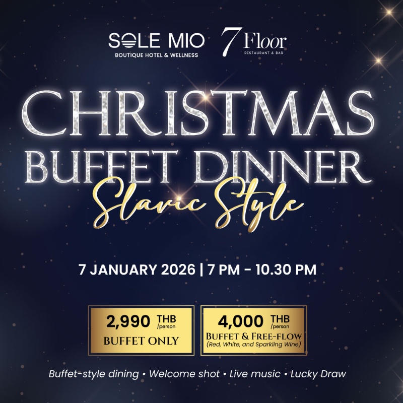 Enjoy a warm rooftop atmosphere above Bangtao, complete with a Russian Christmas buffet, free-flow welcome drinks, and live entertainment throughout the night.