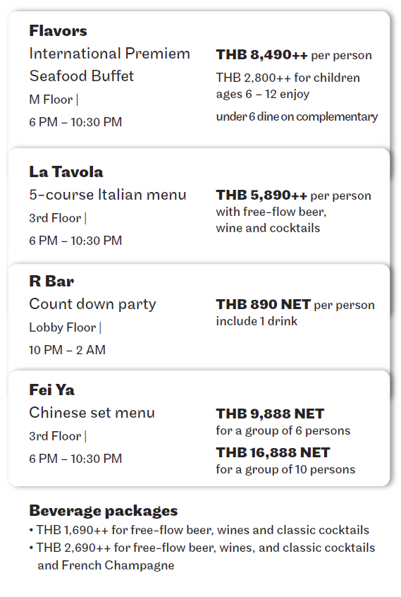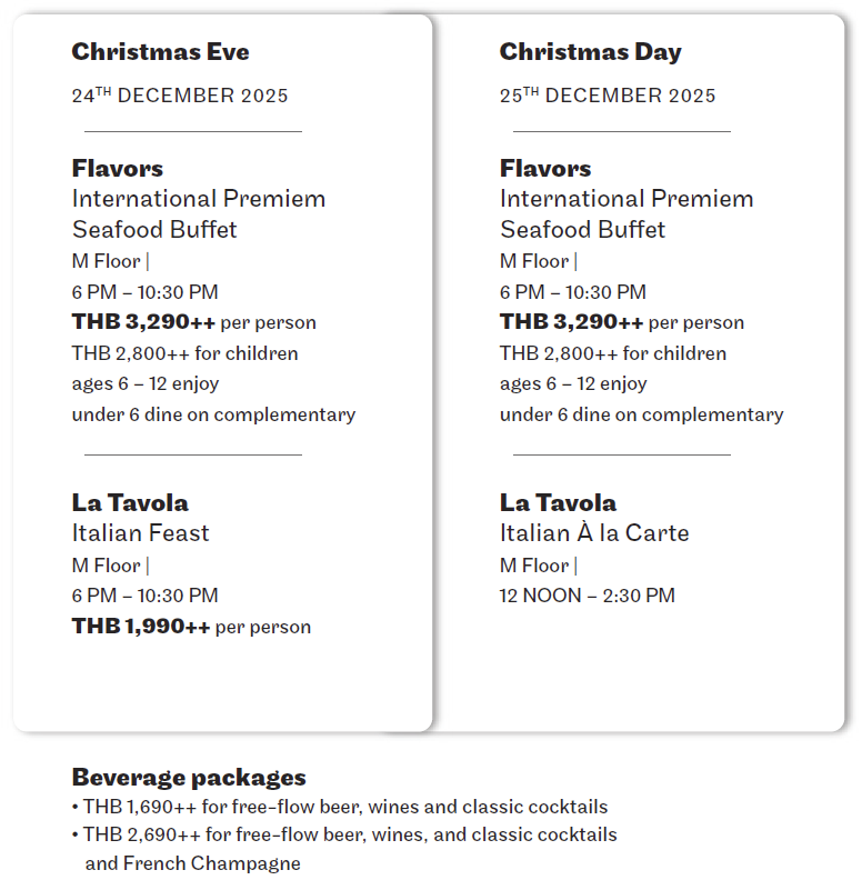 • THB 2,490++ per person (Children under 6 dine complimentary: ages 6–12 enjoy 50% off)