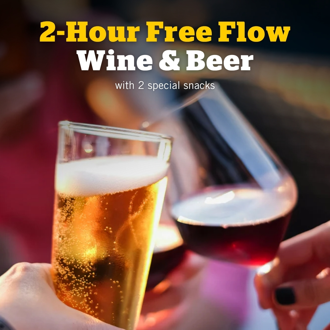 Sip, savor, and unwind! Enjoy 2 hours of free-flow wine and beer with 2 special snacks to complete your perfect evening.
