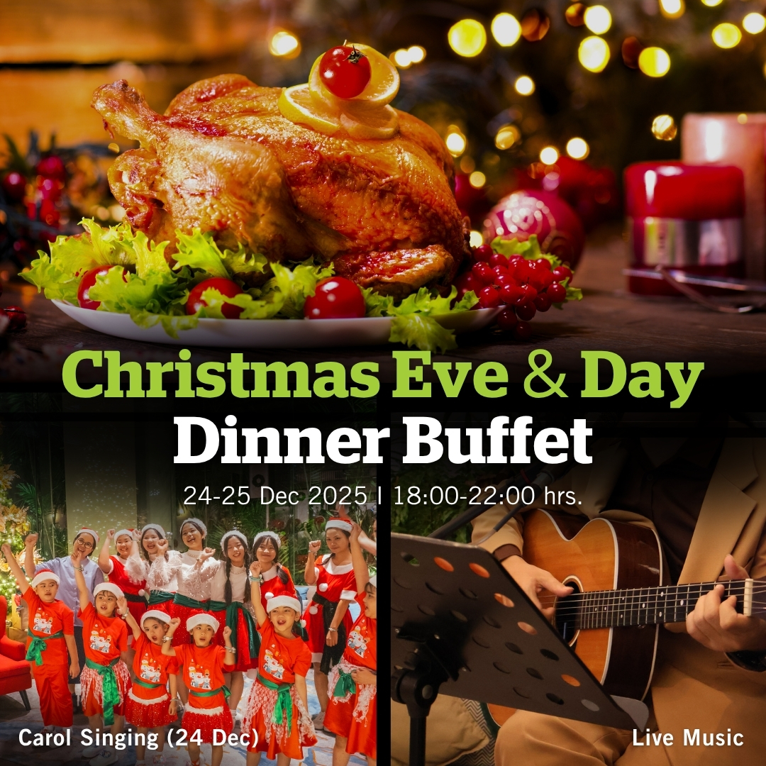 เฉลิมฉลองความสุขแห่งเทศกาลกับคนพิเศษของคุณในบุฟเฟต์นานาชาติ คริสต์มาสอีฟและวันคริสต์มาส เพลิดเพลินกับเมนูคลาสสิกประจำเทศกาล เช่น ไก่งวงอบ แฮมอบ ซีฟู้ดออนไอซ์ ชีส โคลด์คัท และเมนูเฟสทีฟหลากหลายรายการ ดื่มด่ำกับบรรยากาศอบอุ่นของฤดูกาลไปกับ ดนตรีสดสไตล์อะคูสติกตลอดทั้งสองค่ำคืน และร่วมร้องเพลงแครอลกับน้องๆ ในคืนคริสต์มาสอีฟ