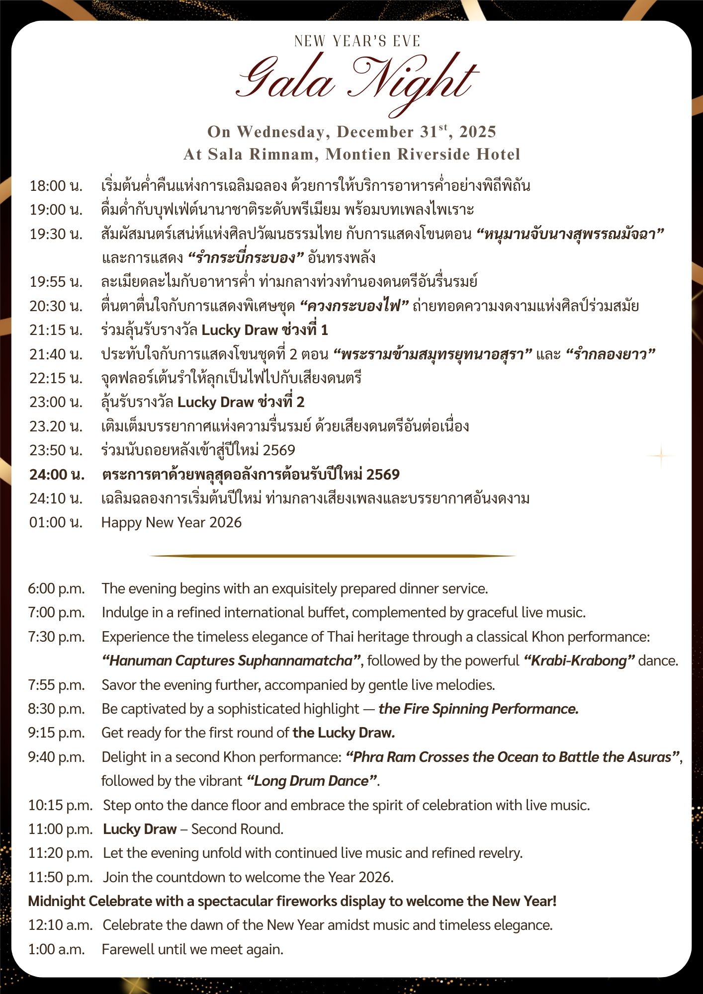 ที่งาน New Year’s Eve Gala Night เราจัดเต็มด้วยอาหารนานาชาติหลากหลายที่คัดสรรด้วยความตั้งใจ ในบรรยากาศริมแม่น้ำสุดอบอุ่น ที่เหมาะกับการฉลองร่วมกันทั้งครอบครัว ✨