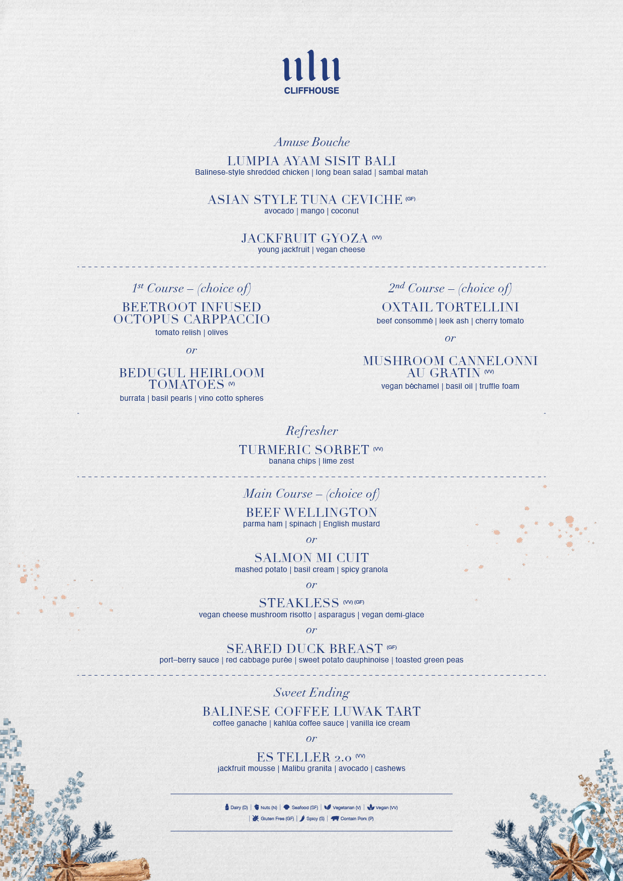 Featuring highlights such as Beetroot Infused Octopus Carpaccio, Oxtail Tortellini, Beef Wellington, and the signature Balinese Coffee Luwak Tart, this festive menu is crafted for those who appreciate culinary excellence.