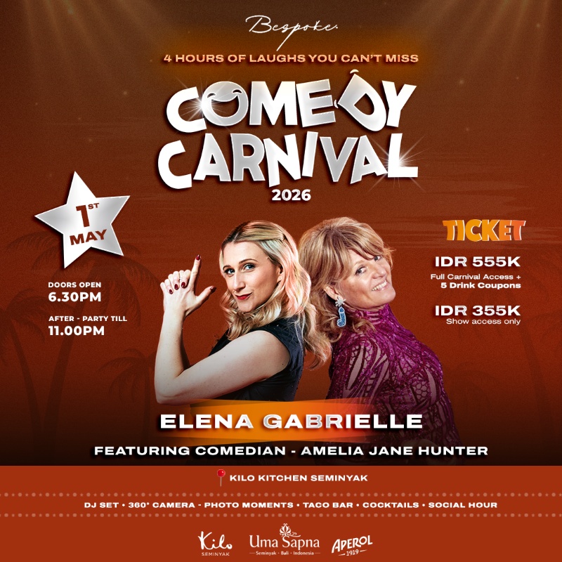 Comedy Carnival brings world-class humor to the stage in Bali, featuring international comedy queen Elena Gabrielle and the razor-sharp Amelia Jane Hunter. This isn’t just a comedy show, it’s a laugh-fueled carnival where fearless punchlines, party vibes, and drink flows come together, shaping a night you won’t forget.