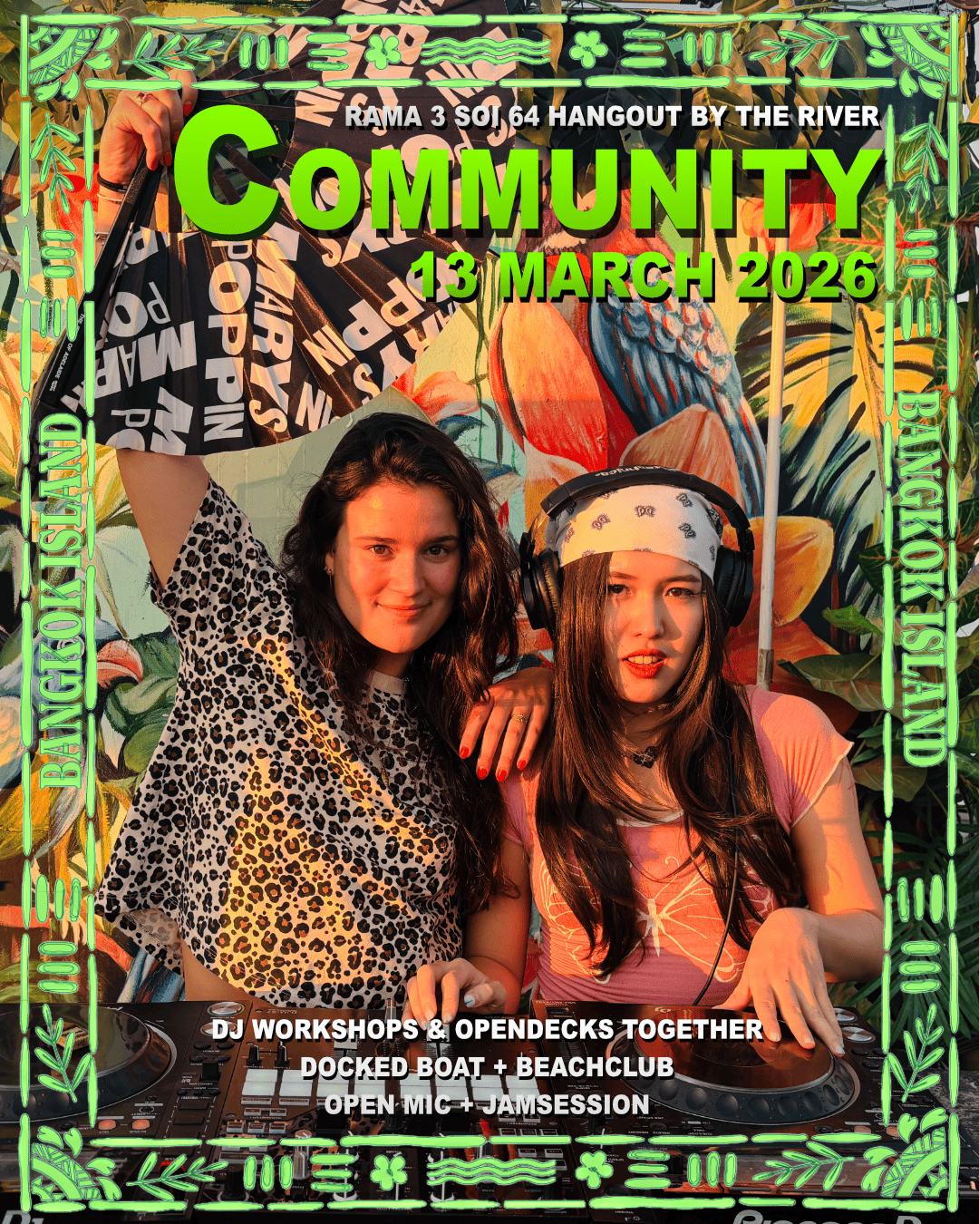 เมื่อพระอาทิตย์ค่อย ๆ ละลายลงสู่แม่น้ำ ค่ำคืนนี้จะเริ่มต้นด้วยเสียงดนตรี การเชื่อมต่อ และการมีส่วนร่วมแบบเต็มพลัง มาร่วมเรียนดีเจบนดาดฟ้า แจมดนตรีสดกับกีตาร์และเพอร์คัสชันแบบเปิดวง และถ้าคุณมีเครื่องดนตรีของตัวเองก็เอามาร่วมจังหวะได้เลย 🎸🥁 ทำความรู้จักผู้คนใหม่ ๆ ผ่าน speed friending, Human Bingo, เกมสลับภาษา และ role play challenges ที่ยิ่งดึกยิ่งสนุก ยิ่งเสียงดัง ยิ่งปล่อยพลังกันมากขึ้น