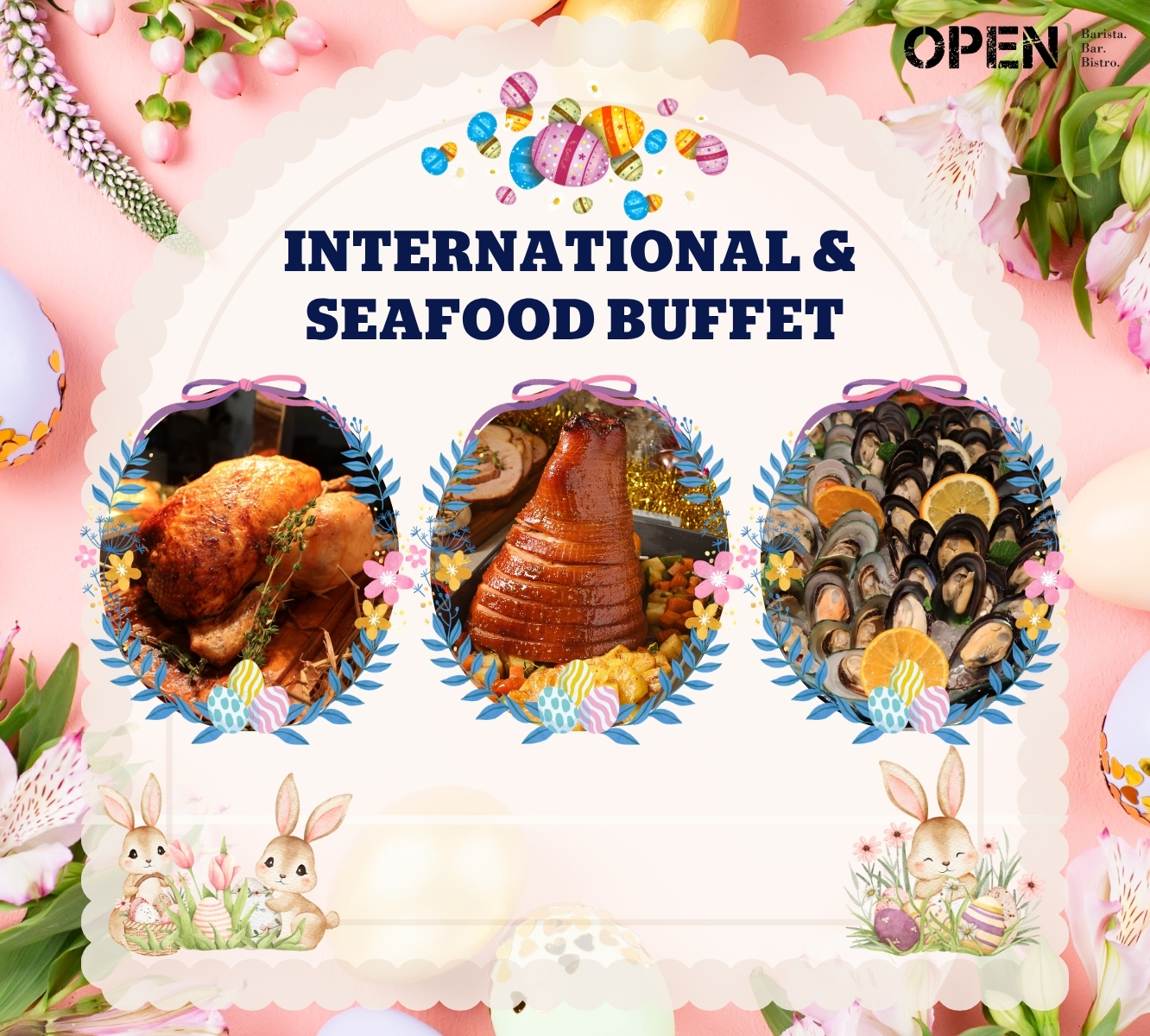 Bring your family together for a joyful 𝗘𝗮𝘀𝘁𝗲𝗿 𝗕𝘂𝗳𝗳𝗲𝘁 𝗟𝘂𝗻𝗰𝗵 Indulge in an international buffet featuring highlights such as seafood on ice, honey-glazed ham, and whole roasted chicken, along with a wide selection of delicious dishes. Enjoy live music and delightful activities for all ages, including Egg Painting & Egg Hunting 🥚