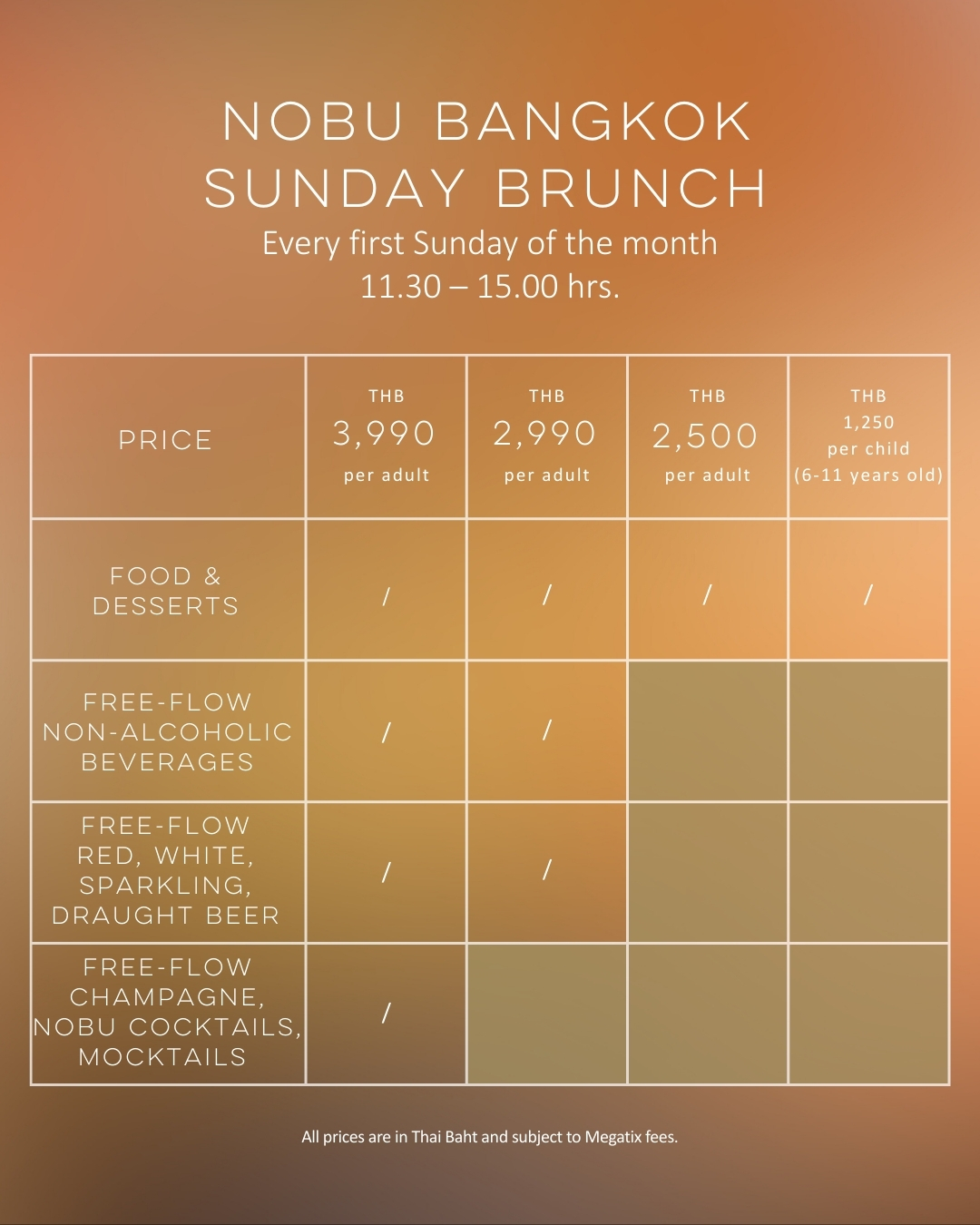 - NOBU BRUNCH: THB 3,990 net per person including food and free-flow non-alcoholic beverages, cocktails, mocktails, champagne, sparkling wine, white wine, red wine, and draught beer