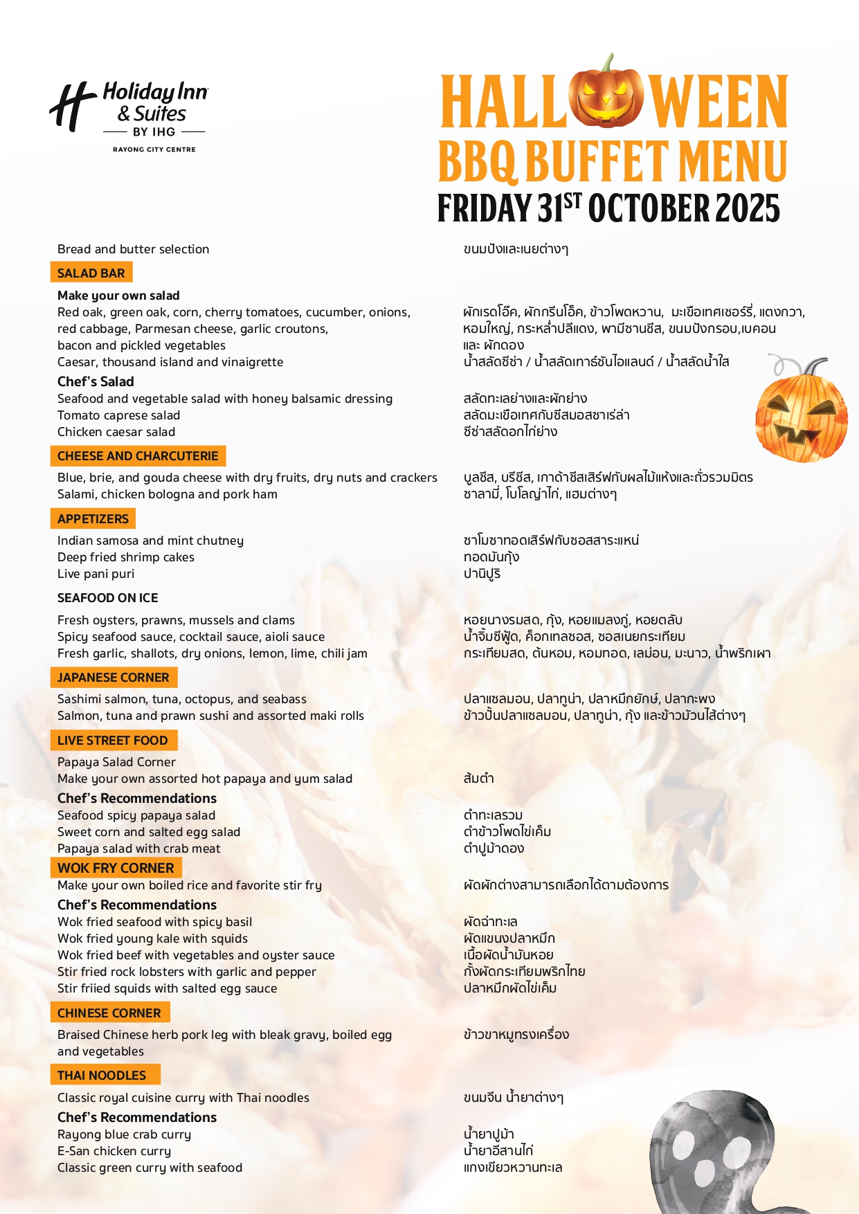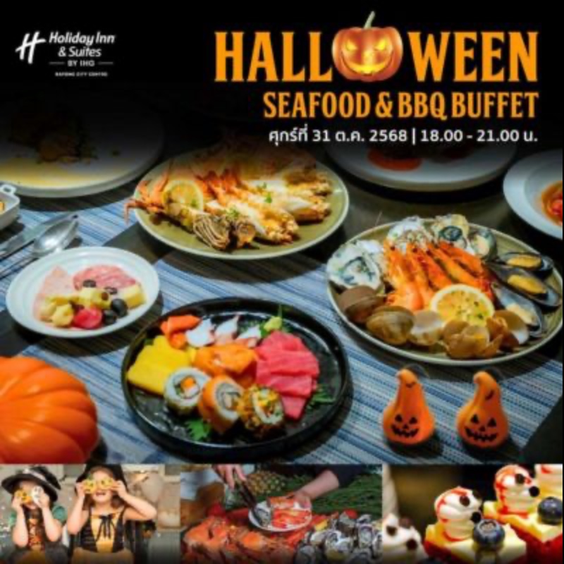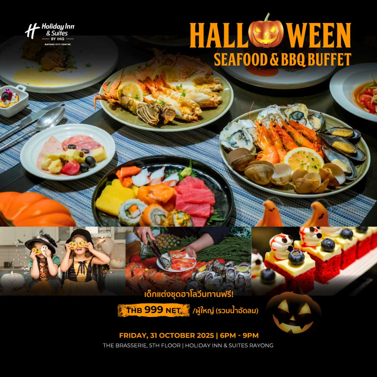 Halloween Seafood & BBQ Buffet Party! at Holiday Inn & Suites Rayong is hosting a spooktacular Halloween buffet that is sure to delight the whole family. Enjoy a wide array of international dishes, live BBQ stations, fresh seafood, and Halloween-themed desserts.