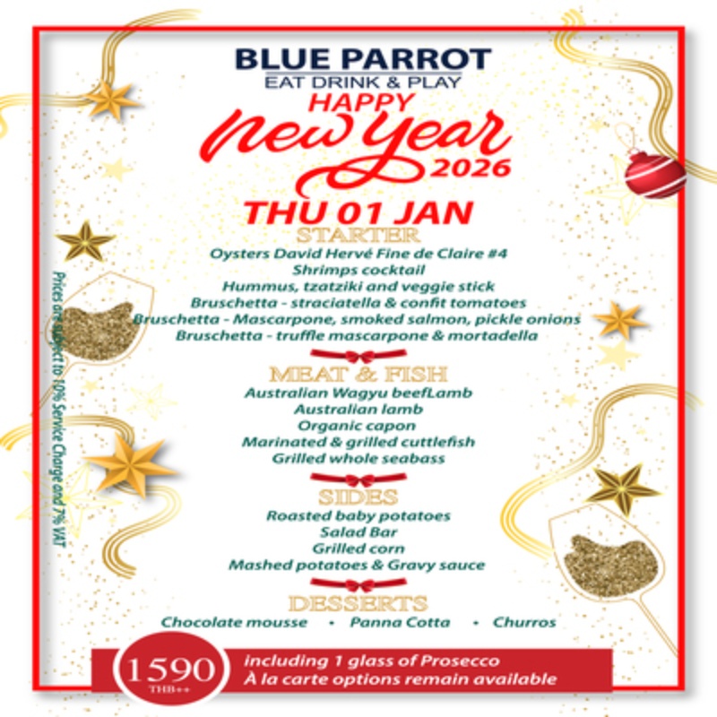 Ring in 2026 with style, joy, and unforgettable flavors at Blue Parrot Bkk! Join us for a dazzling midday celebration on January 1st, 2026, starting from 12:00 PM to 3:00 PM. 🌟 Gather your friends and family for an exciting kickoff to the new year, filled with laughter, delicious food, and great company!