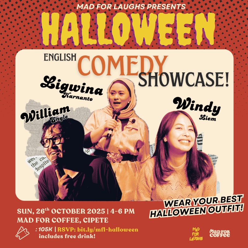 Join us for an afternoon of laughter, tears (of joy!) and witty jokes while wearing your best Halloween outfit! We will be presenting some of the best English-speaking comedians Indonesia has to offer, along with the best vibes and the best people you could ever ask for on a sweet Sunday afternoon.