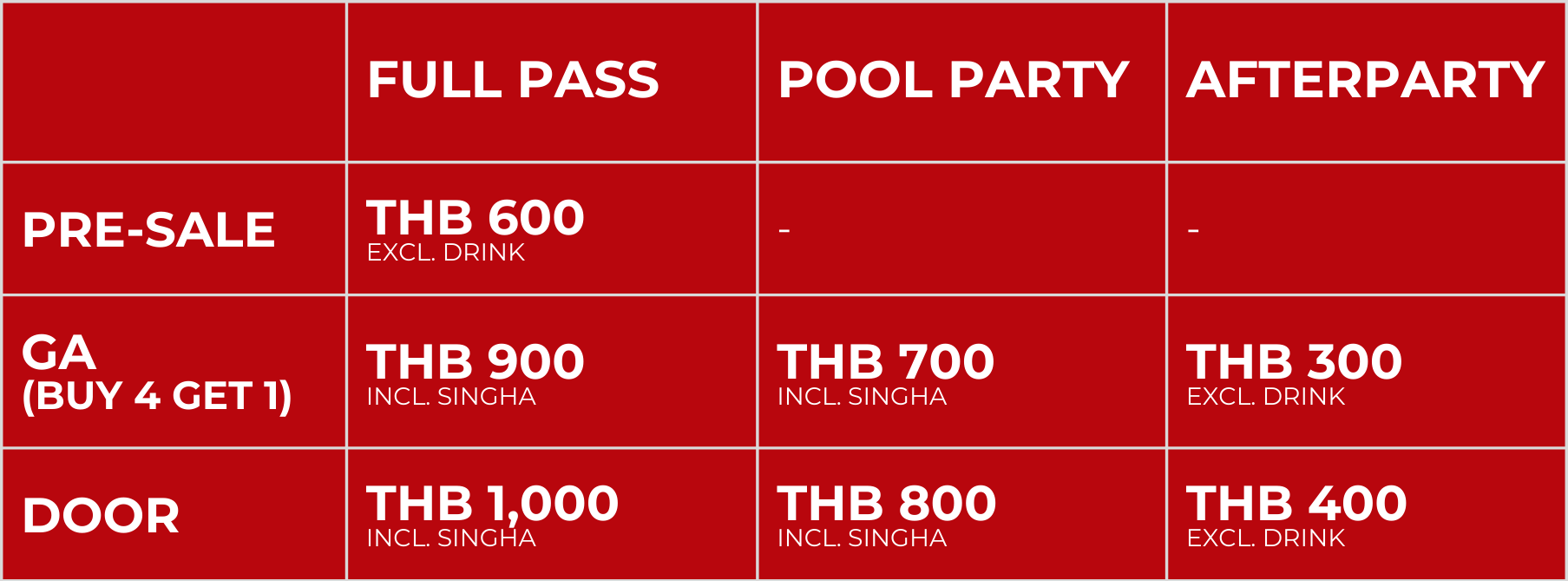 - Wristbands lost will not be replaced, table would have to purchase new wristbands per person at door ticket price; THB 1,000 Full Pass, THB 800 Pool Pass, THB 400 AfterParty Pass