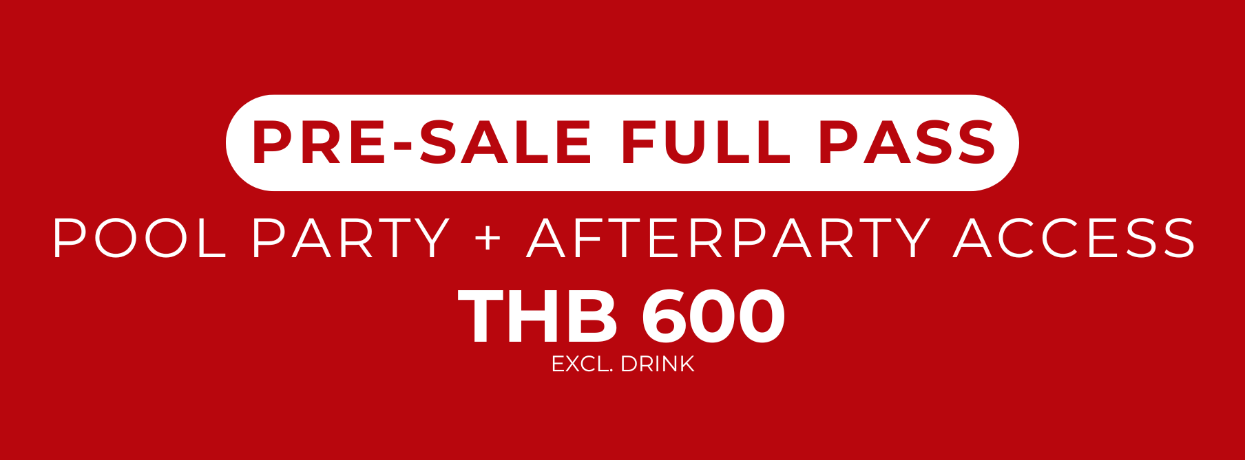 - Extra table wristbands can be purchased at the door ticket price at THB 1,000 Full Pass, THB 800 Pool Pass, THB 400 AfterParty Pass - net per person. up to a maximum of 2 extra wristbands per table.