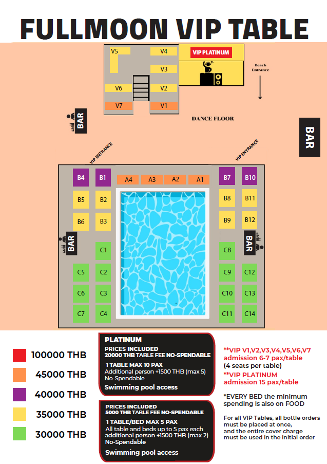 - For VIP Tables bookings, all drinks and bottle orders must be placed at once, and the entire cover charge must be used in the initial order.