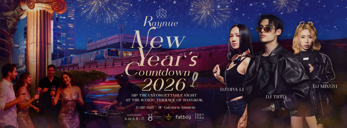 Be part of the New Year’s celebration in the heart of Bangkok at Raynue, where the city’s most iconic terrace comes alive with vibrant energy, top DJs, and exclusive signature dining packages you won’t want to miss.