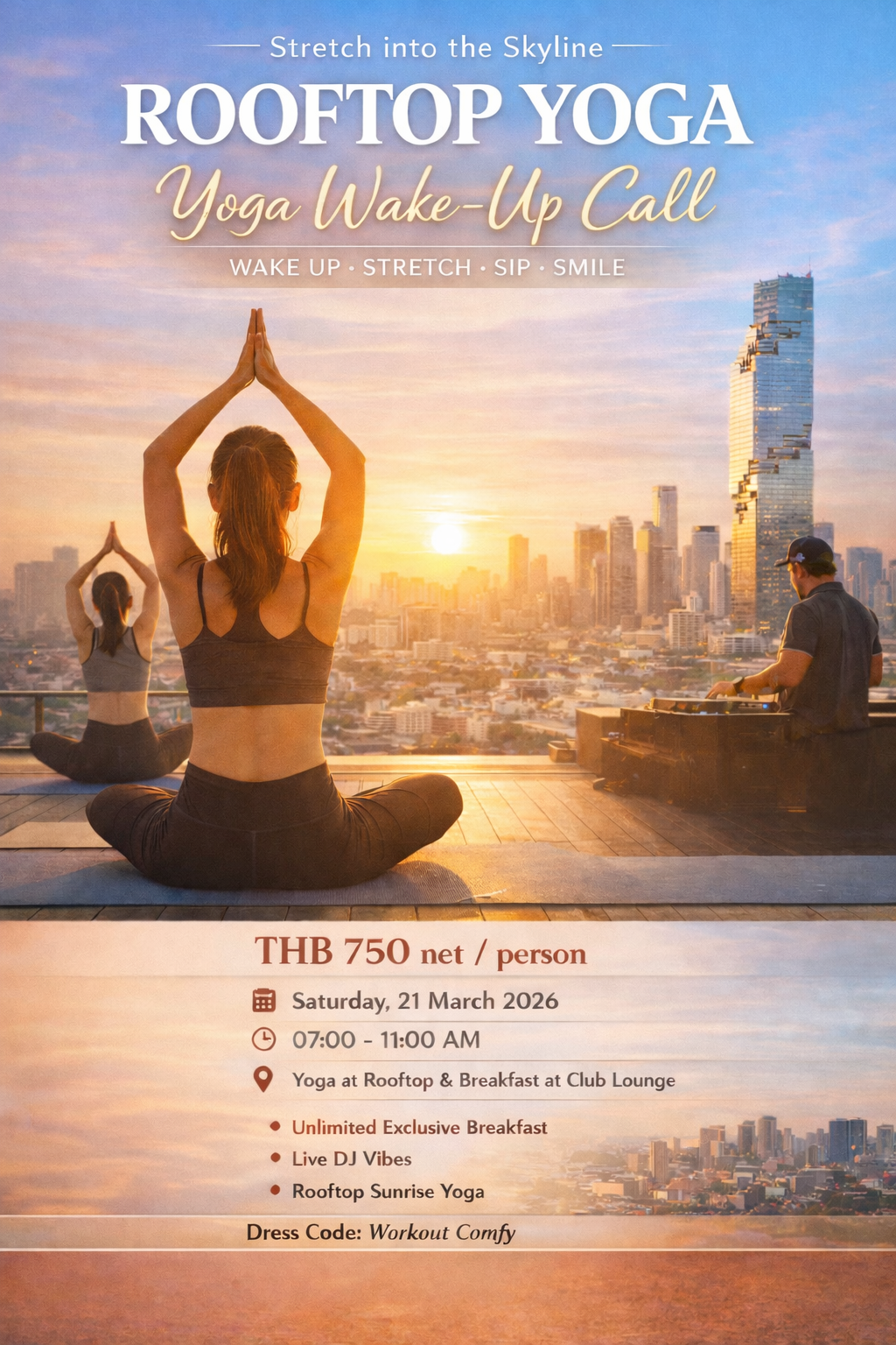 Join our Rooftop Yoga β Yoga Wake-Up Call for a refreshing sunrise flow with skyline views, live DJ vibes, and an exclusive breakfast at our Club Lounge.