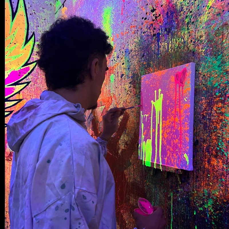 Part art session, part playful chaos — but in neon. You’ll splash, spin, throw, pop, and experiment with glow paint that shines under UV, creating bold, abstract, totally unique art… even if you’ve never painted before.