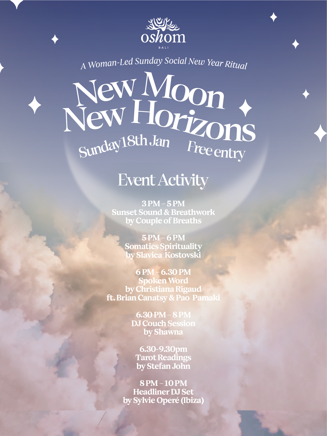 NEW MOON, NEW HORIZONS is a woman-led Sunday social aligned with the potent energy of the New Moon — a sacred moment for intention, renewal, and expansion.