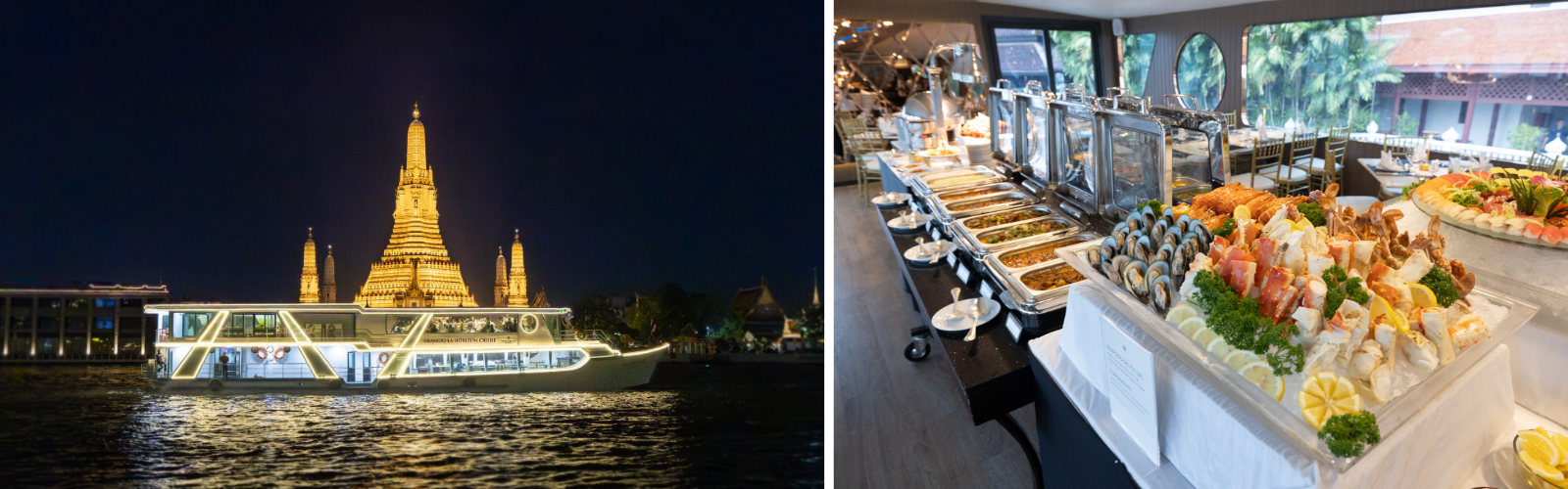 THB 2,900 nett per adult, includes a glass of sparkling wine to start the cruise, free-flowing soft drinks, chilled juice, and water.