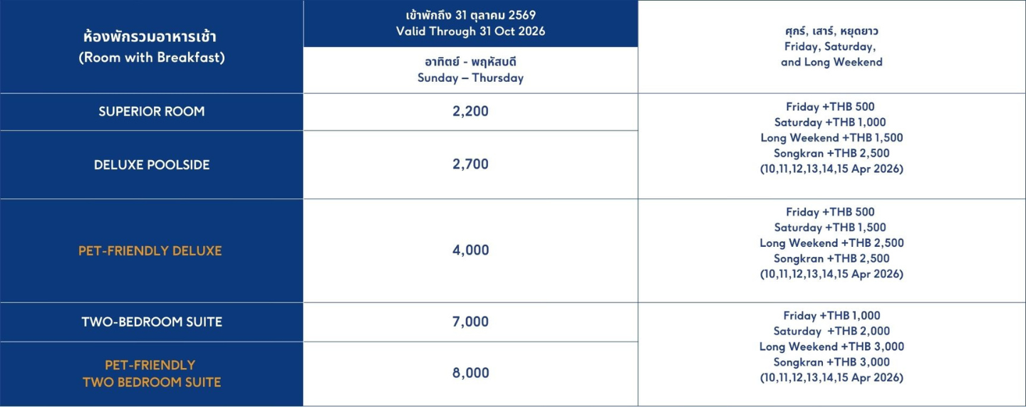 - แพ็กเกจหรือโปรโมชั่นข้างต้นนี้สำหรับซื้อในงานนี้ และสามารถเข้าพักได้ถึง 31 ตุลาคม 2569