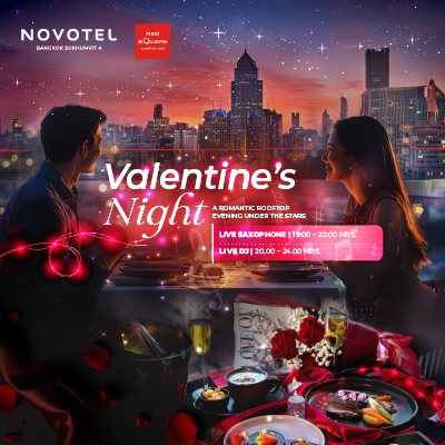 💖Romantic Evening Set (THB 4,499 net/couple): A more premium choice featuring a refined four-course dinner, a romantic rose bouquet, and sparkling rosé (available in sweet or dry)