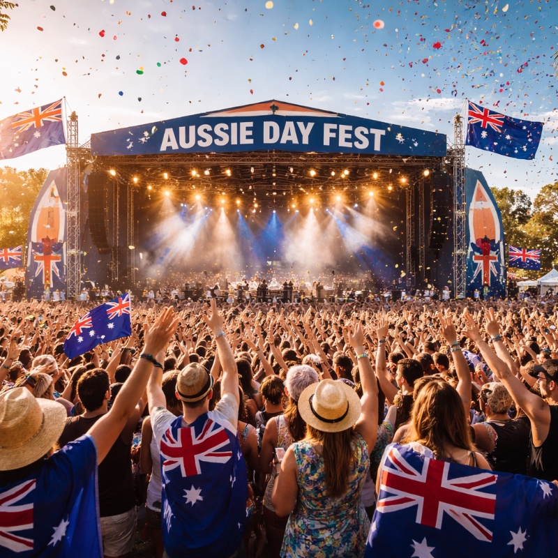 A high-energy Australia Day music festival captured at golden hour, featuring a massive outdoor stage surrounded by a sea of people celebrating under the summer sky. Thousands of festival-goers wave Australian flags, hands in the air, as confetti falls and stage lights glow across the crowd. The atmosphere is electric—sun-soaked, patriotic, and alive with music—blending Aussie pride with a true festival vibe. From the packed crowd and vibrant flags to the warm sunset lighting and full-scale production, the image perfectly reflects the spirit of an iconic Australia Day celebration: unity, music, and unforgettable summer energy.