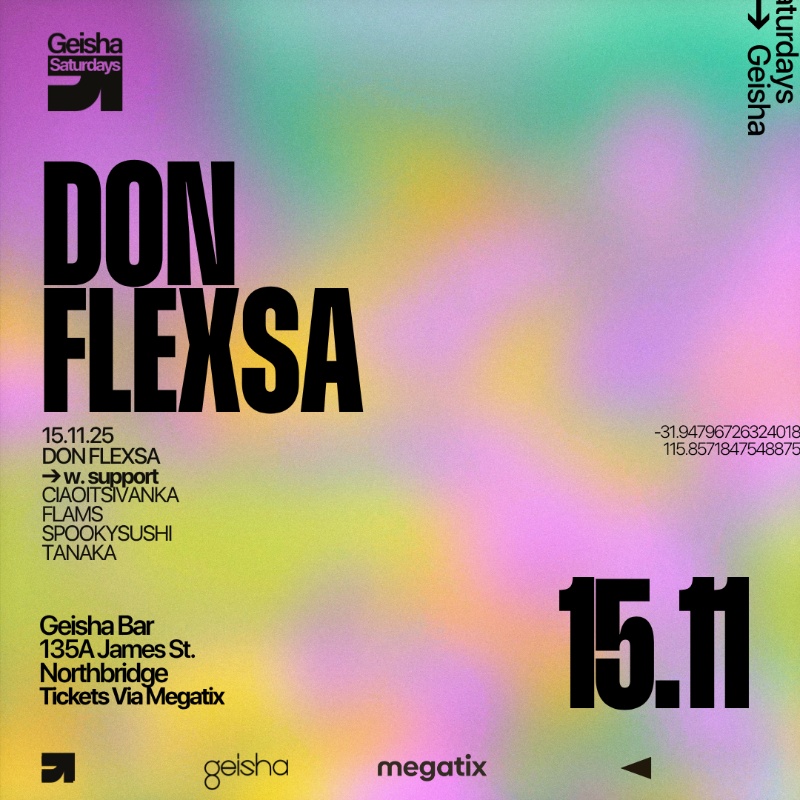 Every Saturday night, Geisha opens its doors to Perth’s underground – showcasing the finest selectors from the local scene and beyond. Expect fine track selection, experienced mixing, and late-night energy in Perth’s most intimate clubbing space.